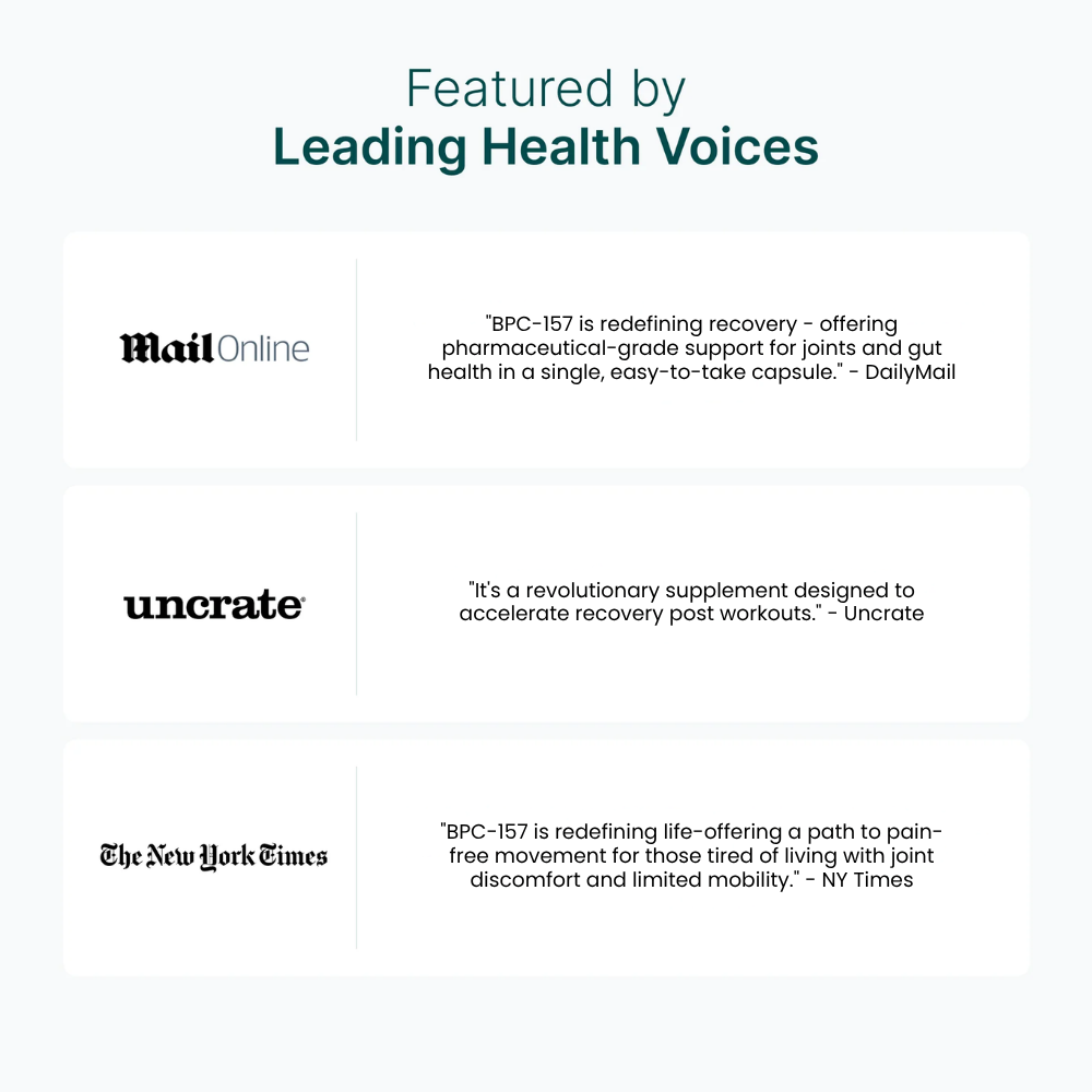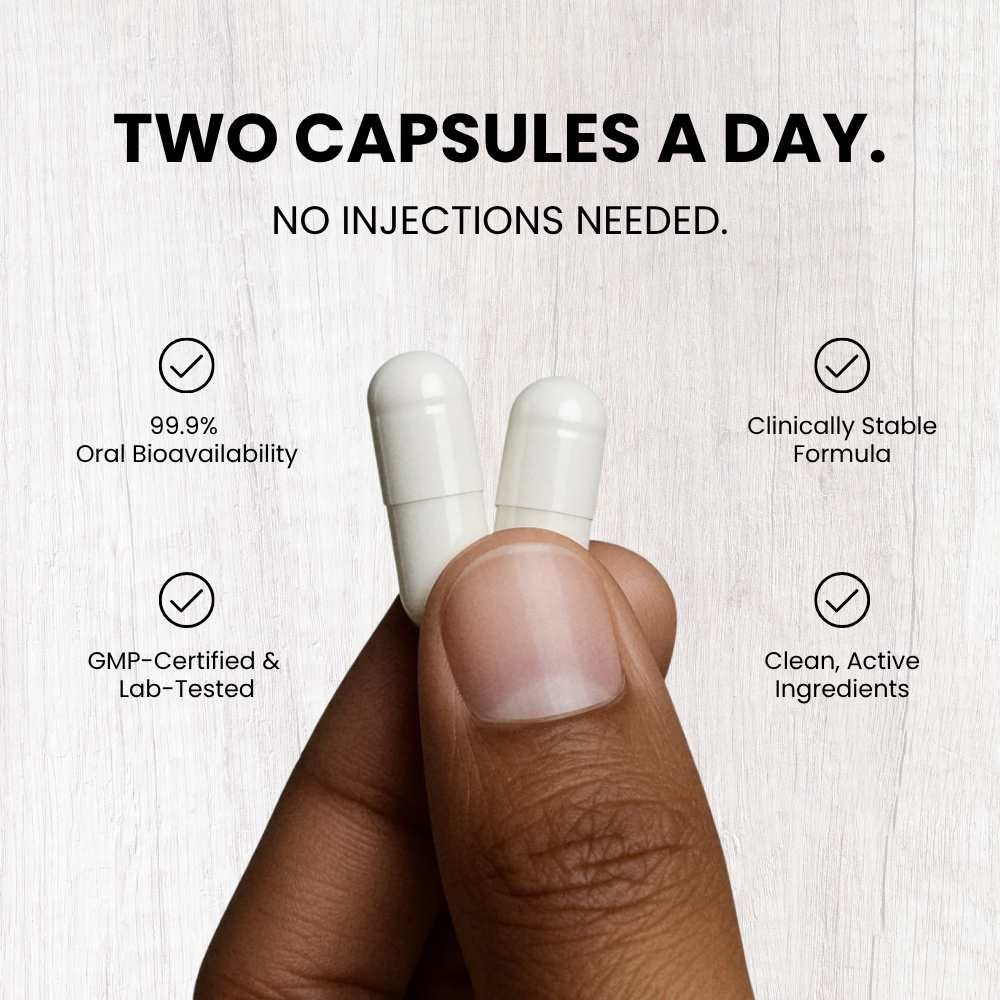 No injections needed. BPC-157 is formulated with an advanced arginine-bound version that offers 99.9% oral bioavailability. This means you get all the benefits through convenient capsules – no needles, no discomfort.